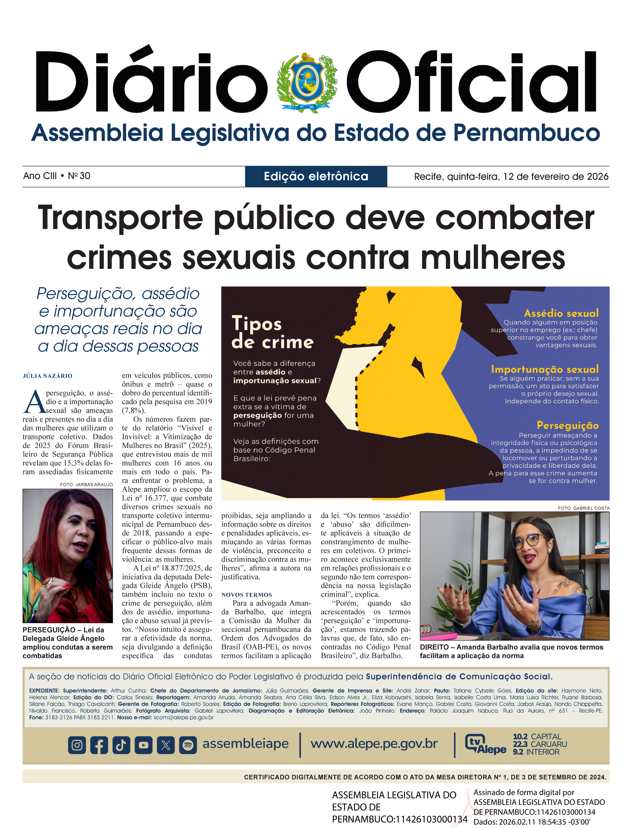 A`S 14:30 HORAS DE 13 DE AGOSTO DE 2024, REUNEM-SE NO PLENÁRIO GOVERNADOR EDUARDO CAMPOS DO EDIFÍCIO GOVERNADOR MIGUEL ARRAES DE ALENCAR, OS DEPUTADOS ADALTO SANTOS; AGLAILSON VICTOR; ÁLVARO PORTO; ANTONIO MORAES; CLAUDIANO MARTINS FILHO; DÉBORA ALMEIDA; DIOGO MORAES; DORIEL BARROS; EDSON VIEIRA; ERIBERTO FILHO; FABRIZIO FERRAZ; FRANCE HACKER; FRANCISMAR PONTES; GILMAR JÚNIOR; GUSTAVO GOUVEIA; HENRIQUE QUEIROZ FILHO; IZAIAS REGIS; JARBAS FILHO; JEFERSON TIMOTEO; JOÃO DE NADEGI; JOÃO PAULO; JOÃO PAULO COSTA; JOAOZINHO TENÓRIO; JOEL DA HARPA; KAIO MANIÇOBA; LUCIANO DUQUE; MÁRIO RICARDO; NINO DE ENOQUE; RENATO ANTUNES; RODRIGO FARIAS; ROMERO SALES FILHO; ROSA AMORIM; SOCORRO PIMENTEL; WALDEMAR BORGES E WILLIAM BRIGIDO (35 PRESENTES). JUSTIFICADAS AS AUSÊNCIAS DOS DEPUTADOS ABIMAEL SANTOS; CLEBER CHAPARRAL; CORONEL ALBERTO FEITOSA; DANI PORTELA; DANNILO GODOY; DELEGADA GLEIDE ÂNGELO; JOAQUIM LIRA; JOSÉ PATRIOTA; LULA CABRAL; PASTOR JÚNIOR TÉRCIO; ROBERTA ARRAES; ROMERO ALBUQUERQUE; SILENO GUEDES E SIMONE SANTANA. LICENCIADOS OS DEPUTADOS ANTONIO COELHO E PASTOR CLEITON COLLINS, EM VIRTUDE DO ATO Nº 1490/2024. O DEPUTADO ÁLVARO PORTO ABRE A REUNIÃO E DESIGNA A DEPUTADA SOCORRO PIMENTEL E O DEPUTADO DIOGO MORAES PARA PRIMEIRA E SEGUNDA SECRETARIAS, RESPECTIVAMENTE. AS ATAS DAS REUNIÕES PLENÁRIAS DOS DIAS 7, 8 E 12 DE AGOSTO DO CORRENTE ANO SÃO LIDAS, SUBMETIDAS À DISCUSSÃO E À VOTAÇÃO, APROVADAS E ENVIADAS À PUBLICAÇÃO. O EXPEDIENTE É LIDO E ENVIADO À PUBLICAÇÃO. INICIA O PEQUENO EXPEDIENTE. O PRESIDENTE CONCEDE A PALAVRA AO DEPUTADO JOÃO PAULO, QUE CELEBRA OS 18 ANOS DA LEI MARIA DA PENHA, UM MARCO NA LUTA CONTRA A VIOLÊNCIA DOMÉSTICA. O PARLAMENTAR ALERTA PARA O AUMENTO DO NÚMERO DE FEMINICÍDIOS NO BRASIL E RESSALTA A IMPORTÂNCIA DA REFERIDA LEI, ENFATIZANDO A NECESSIDADE DE CONTINUAR FORTALECENDO OUTRAS MEDIDAS DE PROTEÇÃO ÀS MULHERES. CONFORME ACORDO DE LIDERANÇAS, O PRESIDENTE INFORMA QUE OCORRERÁ A INVERSÃO DA PAUTA PARA A VOTAÇÃO DA ORDEM DO DIA E SUSPENDE O PEQUENO EXPEDIENTE, A SER RETOMADO APÓS A ORDEM DO DIA DA REUNIÃO EXTRAORDINÁRIA SUBSEQUENTE. INICIA A ORDEM DO DIA. ANUNCIADA A PRIMEIRA DISCUSSÃO DO PROJETO DE LEI COMPLEMENTAR Nº 2039/2024 COM EMENDA MODIFICATIVA Nº 01 DE AUTORIA DO PODER EXECUTIVO, O PRESIDENTE INFORMA QUE A REFERIDA EMENDA ESTÁ PENDENTE DO PARECER DA 10ª COMISSÃO. NA SEQUÊNCIA, CONCEDE A PALAVRA AO DEPUTADO JOÃO DE NADEGI, QUE PROFERE PARECER ORAL PELA APROVAÇÃO NO ÂMBITO DA COMISSÃO DE CIÊNCIA, TECNOLOGIA E INOVAÇÃO. EM ATO CONTÍNUO, SÃO COLHIDOS OS VOTOS DOS DEMAIS MEMBROS DO REFERIDO COLEGIADO, QUE ACOMPANHAM O RELATOR: OS DEPUTADOS JOEL DA HARPA, ADALTO SANTOS E EDSON VIEIRA. TENDO A MATÉRIA RECEBIDO TODOS OS PARECERES DAS COMISSÕES, O PRESIDENTE COLOCA EM DISCUSSÃO PLENÁRIA. NÃO HAVENDO QUEM QUEIRA DISCUTIR, O PRESIDENTE A ENCERRA E INFORMA QUE A VOTAÇÃO OBEDECERÁ AO PROCESSO NOMINAL, ISTO FEITO, VOTAM “SIM” OS DEPUTADOS ADALTO SANTOS; AGLAILSON VICTOR; ÁLVARO PORTO; CLAUDIANO MARTINS FILHO; DÉBORA ALMEIDA; DIOGO MORAES; DORIEL BARROS; EDSON VIEIRA; ERIBERTO FILHO; FABRIZIO FERRAZ; FRANCE HACKER; FRANCISMAR PONTES; GUSTAVO GOUVEIA; HENRIQUE QUEIROZ FILHO; IZAIAS REGIS; JARBAS FILHO; JEFERSON TIMOTEO; JOÃO DE NADEGI; JOÃO PAULO; JOAOZINHO TENÓRIO; JOEL DA HARPA; LUCIANO DUQUE; MÁRIO RICARDO; NINO DE ENOQUE; ROMERO SALES FILHO; SOCORRO PIMENTEL; WALDEMAR BORGES E WILLIAM BRIGIDO (28 VOTOS) E DEIXAM DE VOTAR OS DEPUTADOS ABIMAEL SANTOS; ANTONIO MORAES; CLEBER CHAPARRAL; CORONEL ALBERTO FEITOSA; DANI PORTELA; DANNILO GODOY; DELEGADA GLEIDE ÂNGELO; GILMAR JÚNIOR; JOÃO PAULO COSTA; JOAQUIM LIRA; JOSÉ PATRIOTA; KAIO MANIÇOBA; LULA CABRAL; PASTOR JÚNIOR TÉRCIO; RENATO ANTUNES; ROBERTA ARRAES; RODRIGO FARIAS; ROMERO ALBUQUERQUE; ROSA AMORIM; SILENO GUEDES E SIMONE SANTANA (21 PARLAMENTARES), SENDO APROVADO EM PRIMEIRA DISCUSSÃO O PROJETO DE LEI COMPLEMENTAR Nº 2039/2024 COM EMENDA MODIFICATIVA Nº 01 DE AUTORIA DO PODER EXECUTIVO. É APROVADO EM PRIMEIRA DISCUSSÃO O PROJETO Nº 2036. ANUNCIADA A PRIMEIRA DISCUSSÃO DO PROJETO Nº 2086/2024, O PRESIDENTE INFORMA QUE A MATÉRIA ESTÁ PENDENTE DO PARECER DA 7ª COMISSÃO. NA SEQUÊNCIA, CONCEDE A PALAVRA AO DEPUTADO ROMERO SALES FILHO, PRESIDENTE DA COMISSÃO DE MEIO AMBIENTE, SUSTENTABILIDADE E PROTEÇÃO ANIMAL, QUE DESIGNA O DEPUTADO LUCIANO DUQUE PARA A RELATORIA DA MATÉRIA. O DEPUTADO LUCIANO DUQUE PROFERE PARECER ORAL PELA APROVAÇÃO. EM ATO CONTÍNUO, SÃO COLHIDOS OS VOTOS DOS DEMAIS MEMBROS DO REFERIDO COLEGIADO, QUE ACOMPANHAM O RELATOR: OS DEPUTADOS HENRIQUE QUEIROZ FILHO, NINO DE ENOQUE E DIOGO MORAES. TENDO A MATÉRIA RECEBIDO TODOS OS PARECERES DAS COMISSÕES, O PRESIDENTE COLOCA EM DISCUSSÃO PLENÁRIA. NÃO HAVENDO QUEM QUEIRA DISCUTIR, É APROVADO EM PRIMEIRA DISCUSSÃO O PROJETO Nº 2086/2024. SÃO APROVADOS EM PRIMEIRA DISCUSSÃO OS PROJETOS NºS. 2090; 2112 E 2113. ANUNCIADA A DISCUSSÃO ÚNICA DO PROJETO DE RESOLUÇÃO Nº 1798/2024.NÃO HAVENDO QUEM QUEIRA DISCUTIR, O PRESIDENTE A ENCERRA E INFORMA QUE A VOTAÇÃO OBEDECERÁ AO PROCESSO NOMINAL, ISTO FEITO, VOTAM “SIM” OS DEPUTADOS ADALTO SANTOS; AGLAILSON VICTOR; ÁLVARO PORTO; CLAUDIANO MARTINS FILHO; DÉBORA ALMEIDA; DIOGO MORAES; DORIEL BARROS; EDSON VIEIRA; ERIBERTO FILHO; FABRIZIO FERRAZ; FRANCE HACKER; FRANCISMAR PONTES; GUSTAVO GOUVEIA; HENRIQUE QUEIROZ FILHO; IZAIAS REGIS; JARBAS FILHO; JEFERSON TIMOTEO; JOÃO DE NADEGI; JOÃO PAULO; JOAOZINHO TENÓRIO; JOEL DA HARPA; LUCIANO DUQUE; MÁRIO RICARDO; NINO DE ENOQUE; ROMERO SALES FILHO; SOCORRO PIMENTEL; WALDEMAR BORGES E WILLIAM BRIGIDO (28 VOTOS) E DEIXAM DE VOTAR OS DEPUTADOS ABIMAEL SANTOS; ANTONIO MORAES; CLEBER CHAPARRAL; CORONEL ALBERTO FEITOSA; DANI PORTELA; DANNILO GODOY; DELEGADA GLEIDE ÂNGELO; GILMAR JÚNIOR; JOÃO PAULO COSTA; JOAQUIM LIRA; JOSÉ PATRIOTA; KAIO MANIÇOBA; LULA CABRAL; PASTOR JÚNIOR TÉRCIO; RENATO ANTUNES; ROBERTA ARRAES; RODRIGO FARIAS; ROMERO ALBUQUERQUE; RO